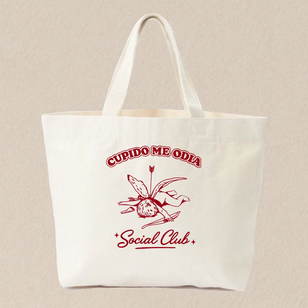La Tote Bag “Cupido me odia, social club” es para quienes ya aceptaron que el amor es un chiste… y se ríen primero.
